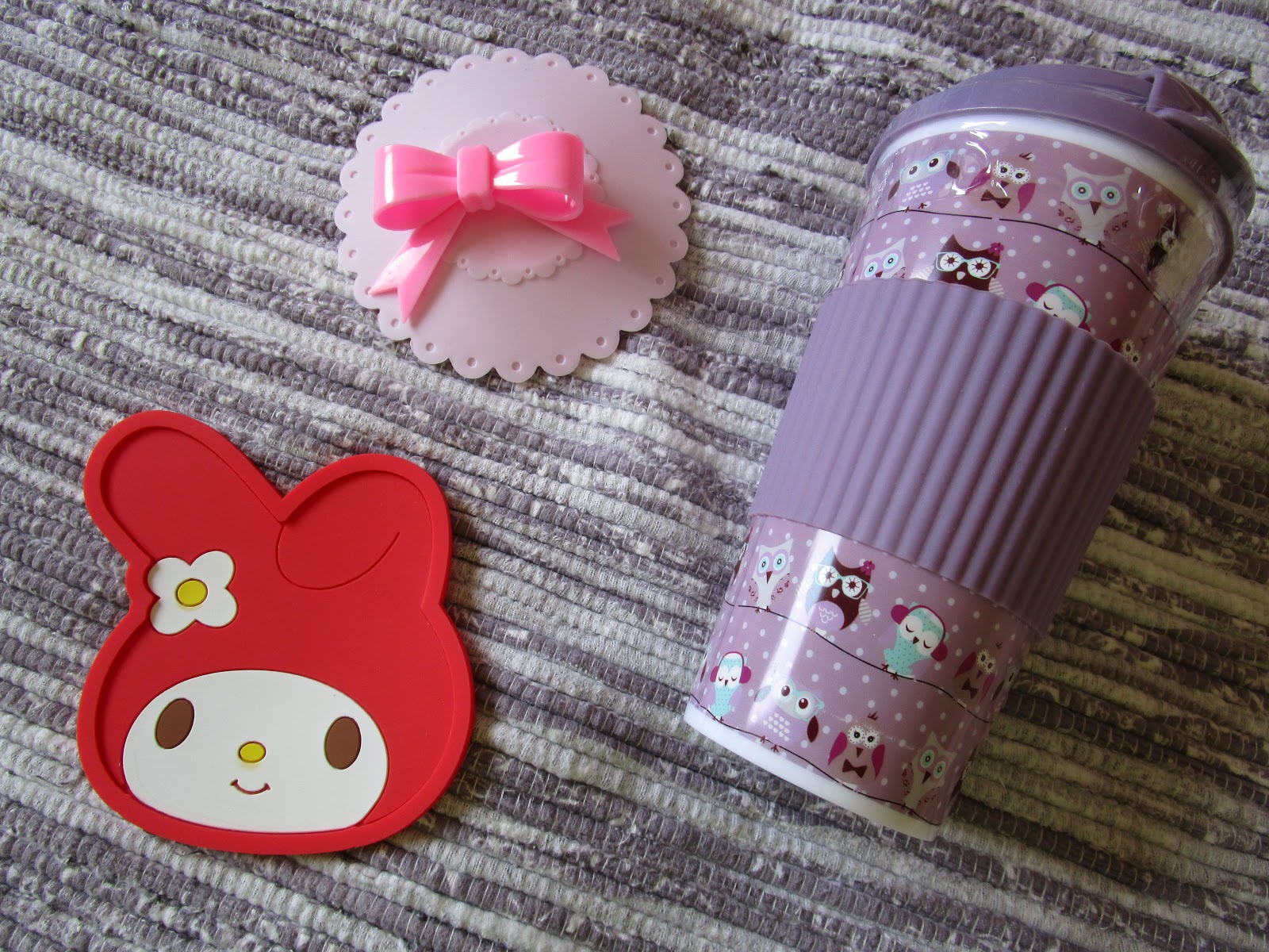Os prémios deste giveaway são um copo de corujinha, uma base para copos da my melody e ainda um tapa copos com um laçinho.